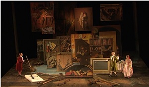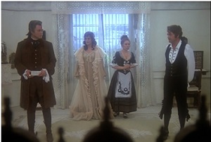 Е.Ш. На этом примере мы видим амбивалентность образов оперы Моцарта, которые могут легко меняться местами или растворяться в общем пространстве игры и интриги, которые превращают шедевр композитора в милый пустячок с намеком нат рокайльную изыканность. Отсутсвие героя, доминанта, истинного носителя власти делает бессмысленным само существование оппозиции "Господство/Подчинение" в контексте рутинных интриг, обид и удовольствий, происходящих в ризомообразном пространстве легко меняющихся декораций.